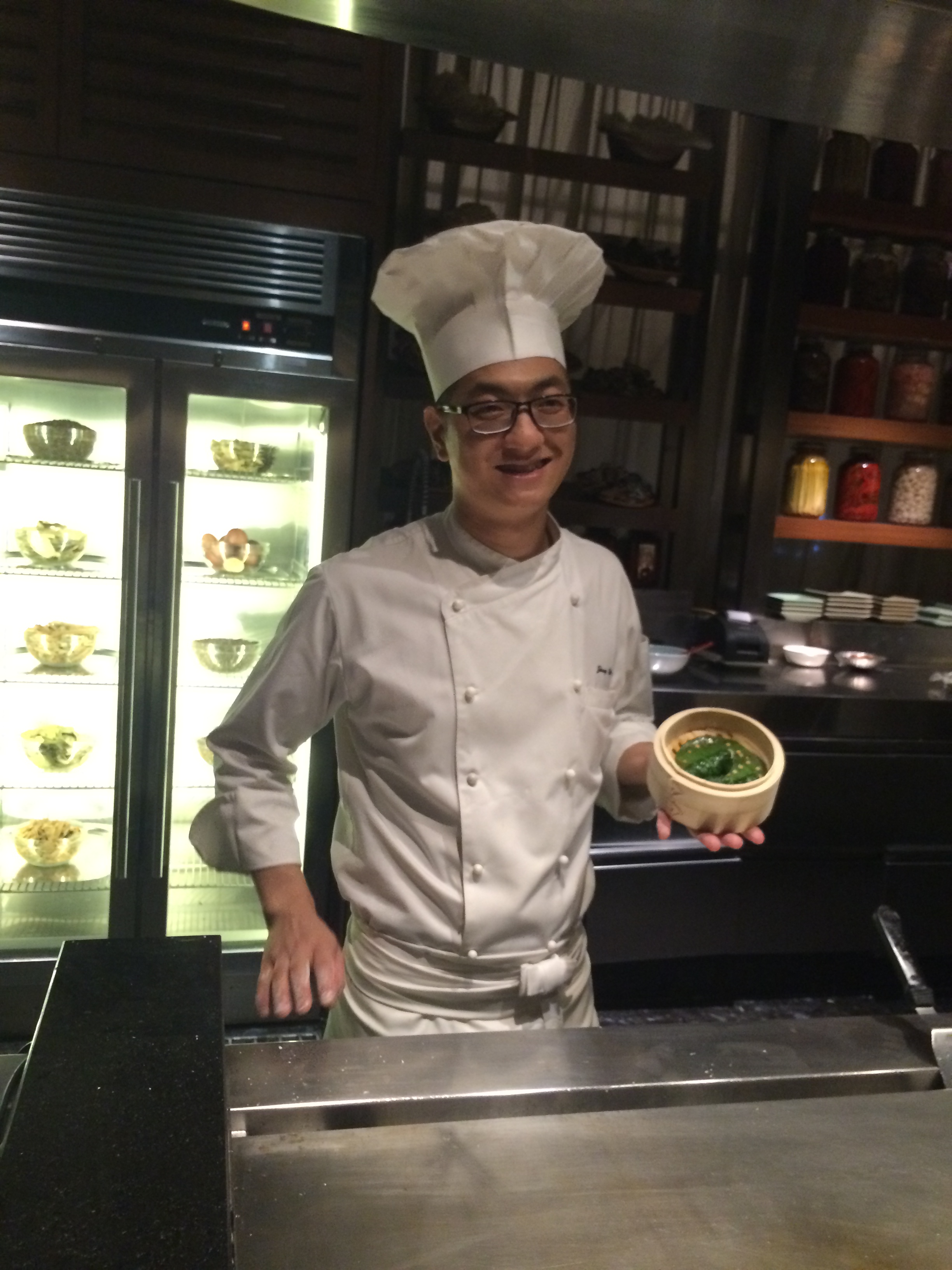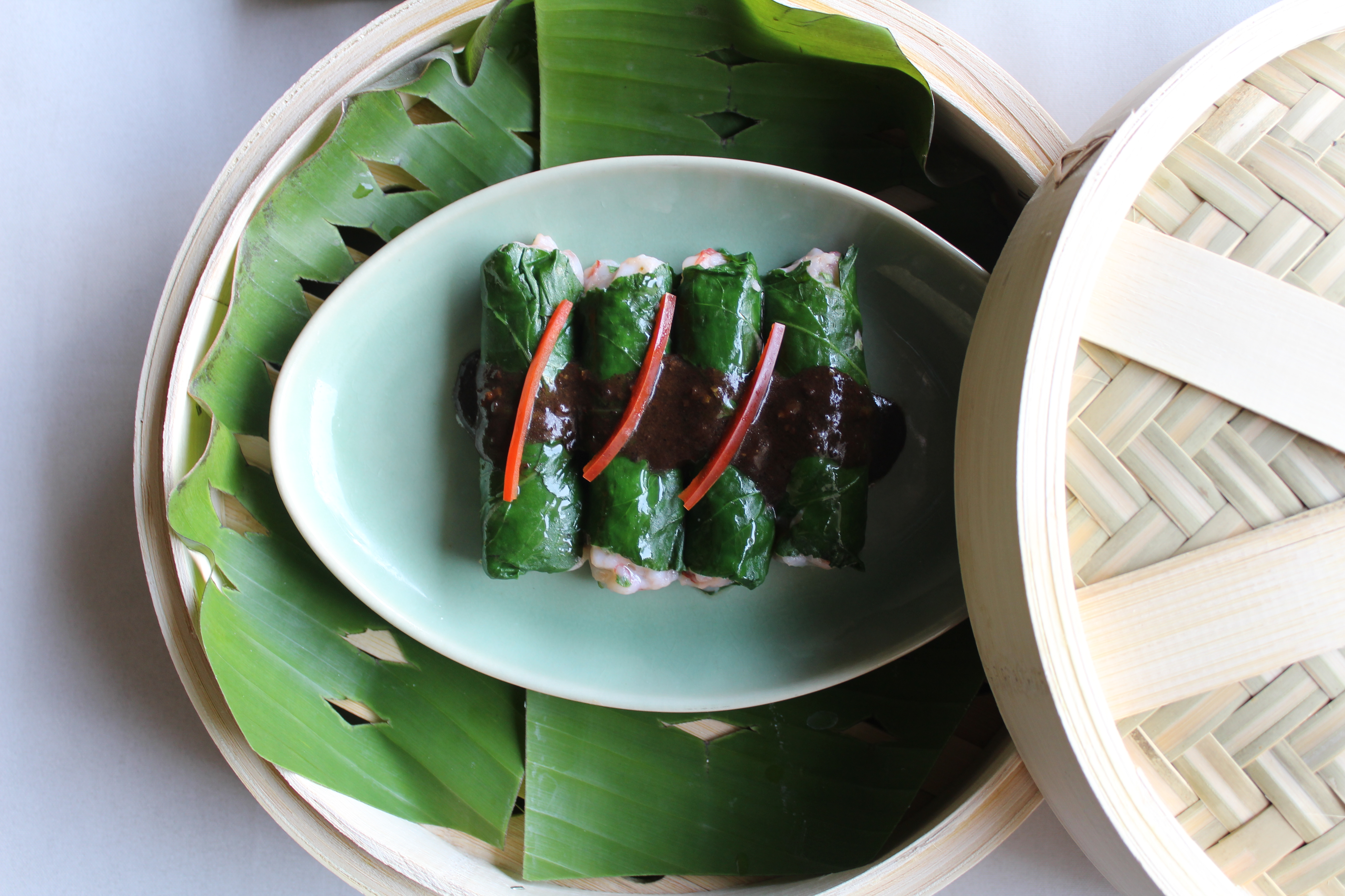 It was a keen bunch of a couple of food bloggers, including yours truly, who had the privilege of being taught by Chef Zhang about the fine art of dimsum dough making, rolling and steaming, as he showcased two recipes. Dimsums are the generic name, and the shape varies between dumplings, rolls and buns. Zhang started off with a spinach prawn roll, in which a blanched spinach leaf was rolled out like a dimsum sheet with minced prawn as filling. Deft at his craft, the chef kept doling out useful tips like how the filling should be glazed with sesame oil and potato starch, and the fact that prawn dimsums  require as little as 4 minutes to cook, chicken 5 minutes and lamb 6-8 minutes.
