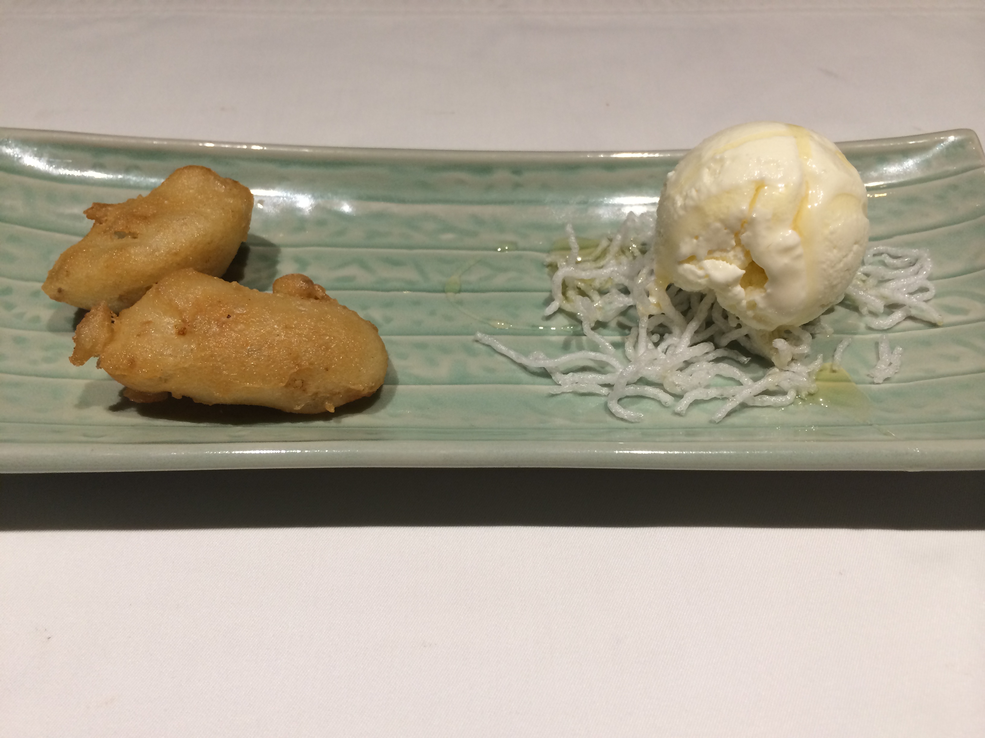 For desserts, there was a delightful combination of fried banana fritters with coconut ice cream. Quite the ending to a perfect meal, with a Zen like state of mind overcoming me.